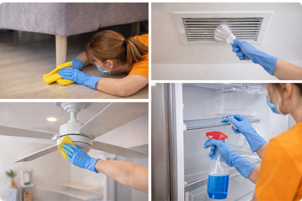 Le nettoyage en profondeur est idéal pour les espaces nécessitant une désinfection plus complète. Il comprend un nettoyage intensif des surfaces, des endroits difficiles d’accès, des électroménagers et des zones à fort achalandage, afin d’assurer un environnement entièrement propre et rafraîchi.